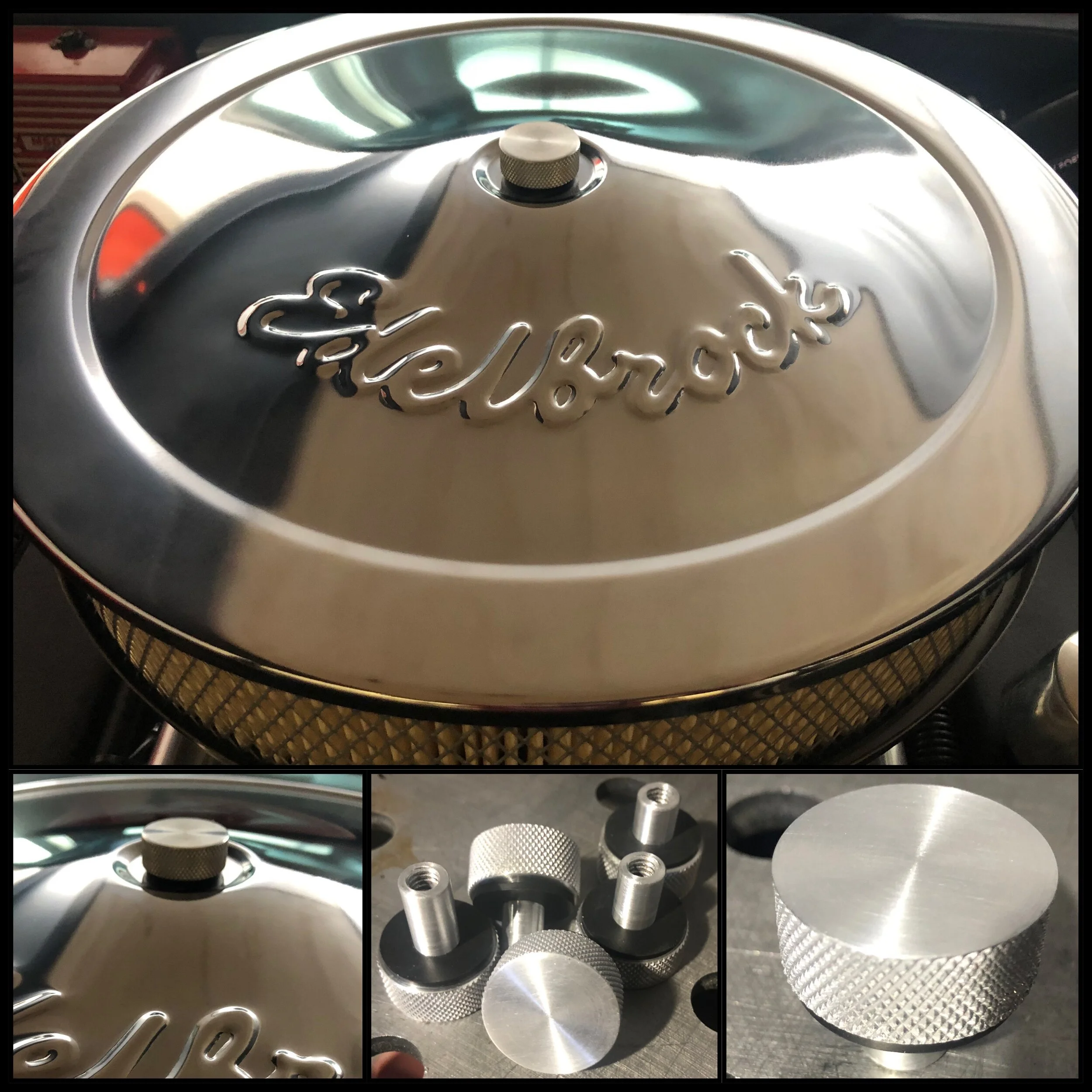 A great example of custom parts are these air filter hold downs. Made of one piece of aluminum, a long female thread is used to secure the air cleaner and the outside is knurled for easy grip. Topped off with a rubber base to keep unfiltered air out and help the air filter not vibrate loose.